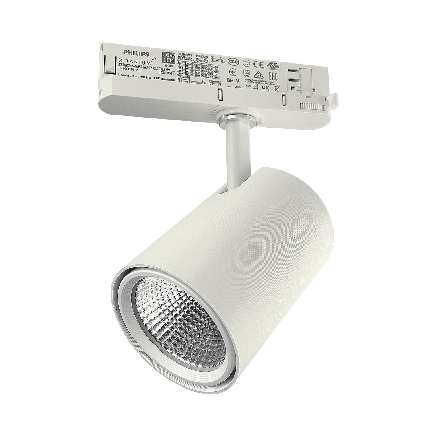 Ausgestattet mit einem integrierten Philips Xitanium LED-Treiber bietet die Leuchte eine hohe Effizienz, stabile Lichtleistung und einen exzellenten Leistungsfaktor von 0,96. Die robuste Bauweise, das schlichte weiße Gehäuse und die einfache Montage auf MS-Track-Schienensystemen machen den Strahler zu einer langlebigen und flexiblen Beleuchtungslösung für den professionellen Einsatz.